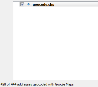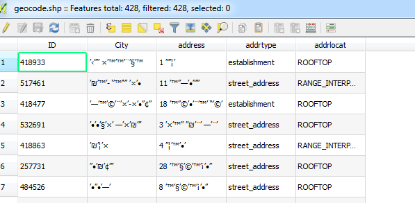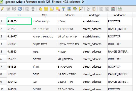 בסיום התהליך נקבל קובץ SHP שיעלה לנו על המפה ותוצאת הגיאקוד , בטבלת המאפיינים נקבל גם נתונים לגבי רמת הדיוק בהתאם למקובל בגוגל
