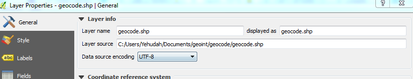 אם טבלת המאפיינים נפתחת לנו בג’יבריש יש לשנות באפייני השכבה ל UTF-8